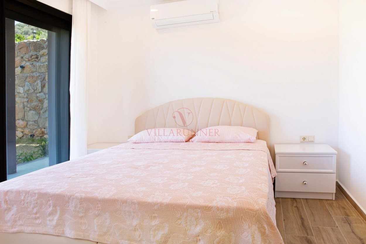 Oldukça geniş ve yarı-korunaklı özel havuz ve bahçeye sahip bu şık tatil evinin girişinde, 3 araçlık özel park alanı bulunmaktadır. Bu bölümden; açık yüzme havuzu/bahçe bölümüne ve evin ana giriş kapısına geçiş sağlanmaktadır. Dubleks villanın giriş katında açık plan salon, tam donanımlı mutfak, ayrı yemek alanı, 1 adet 2 tekli yatağa sahip yatak odası ve banyo / tuvalet bulunmaktadır. Üst katta biri giyinme odalı, çift kişilik yataklı ve kanepeli oldukça geniş master yatak odası, hemen yanında bu oda ile birlikte kullanılan, misafirlerin sabah kahvelerinin keyfini kuş sesleri ile çıkarabileceği balkona sahip çift kişilik yatak odası bulunmaktadır. Bu katta 2 adet tekli yatağa sahip bir oda daha bulunmaktadır. Odaların tamamı klimalıdır ve evde toplam 4 adet banyo / tuvalet mevcuttur.