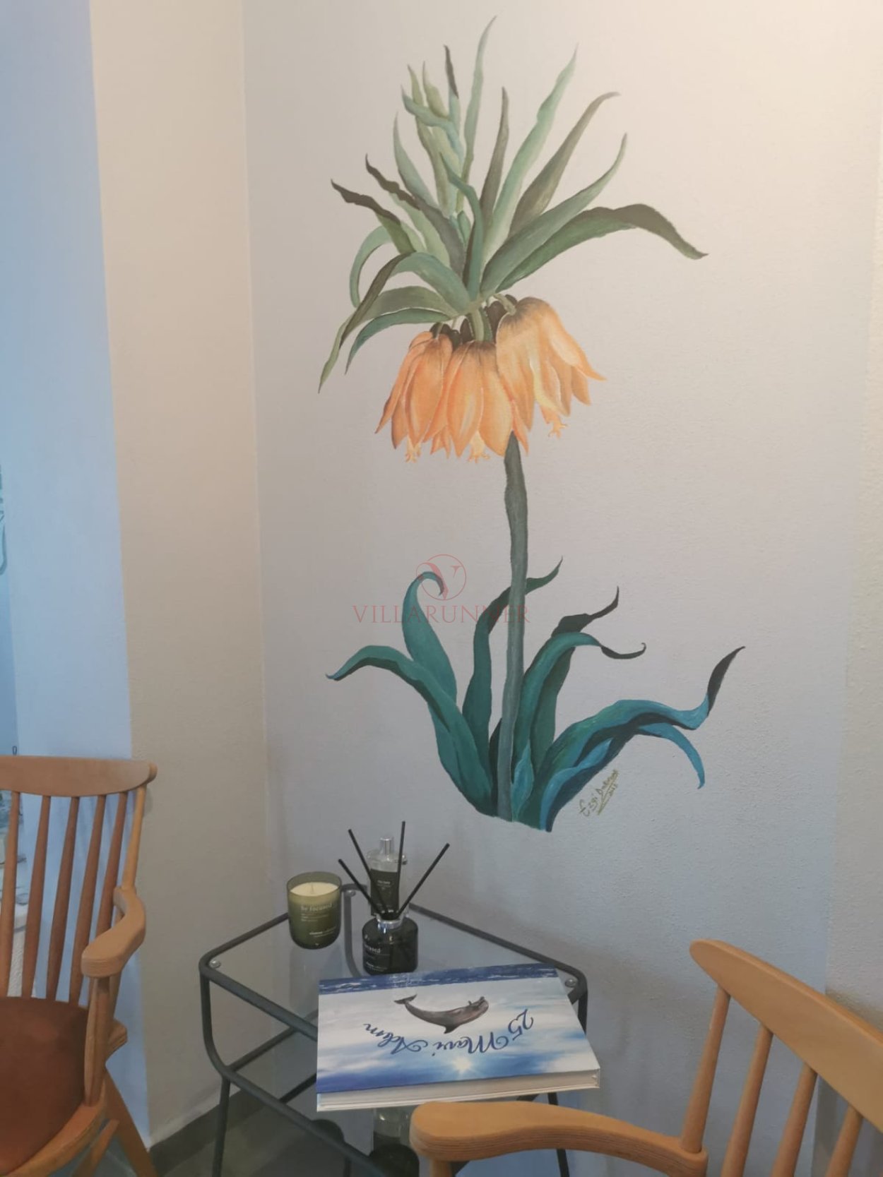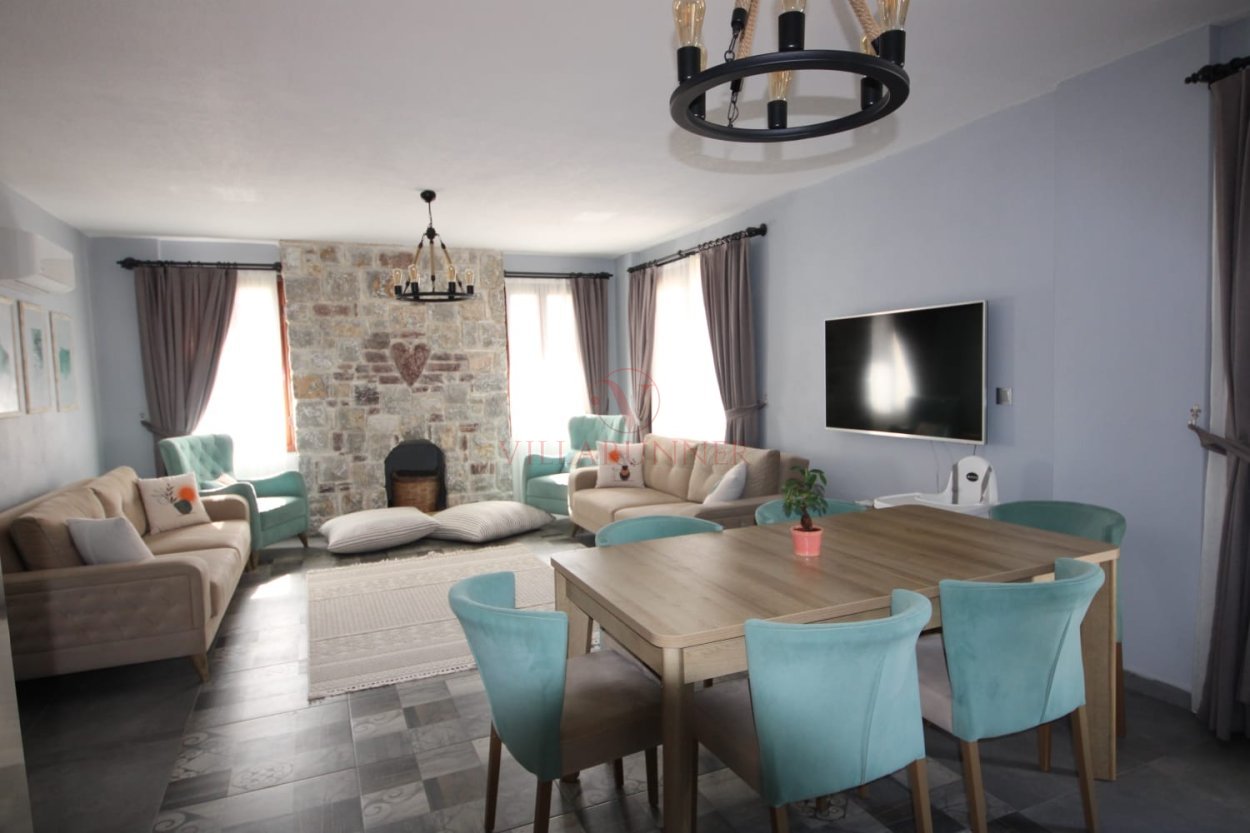 * Salon: 2 adet tek kişilik, 2 adet üçlü, klima, televizyon, sehpa, şömine, masa ve sandalyeler bulunmaktadır. (giriş kat)