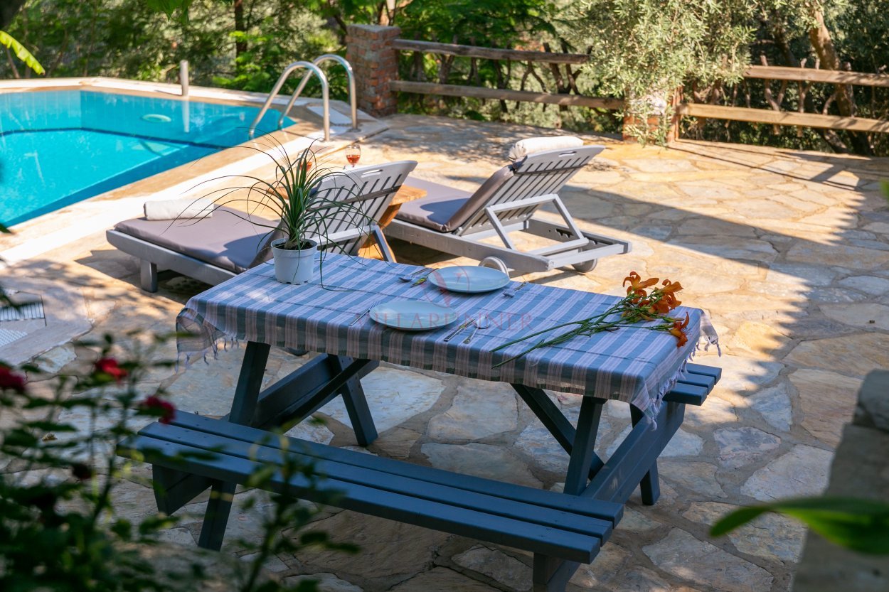 600 x 300 x 170 cm ölçülerindeki özel yüzme havuzuna ek olarak 100x100 ölçülerinde bir bebek havuzu bulunmaktadır. Havuz alanında ayrıca iki adet şezlong, bir oturma grubu, salıncaklar ve şemsiye vardır.