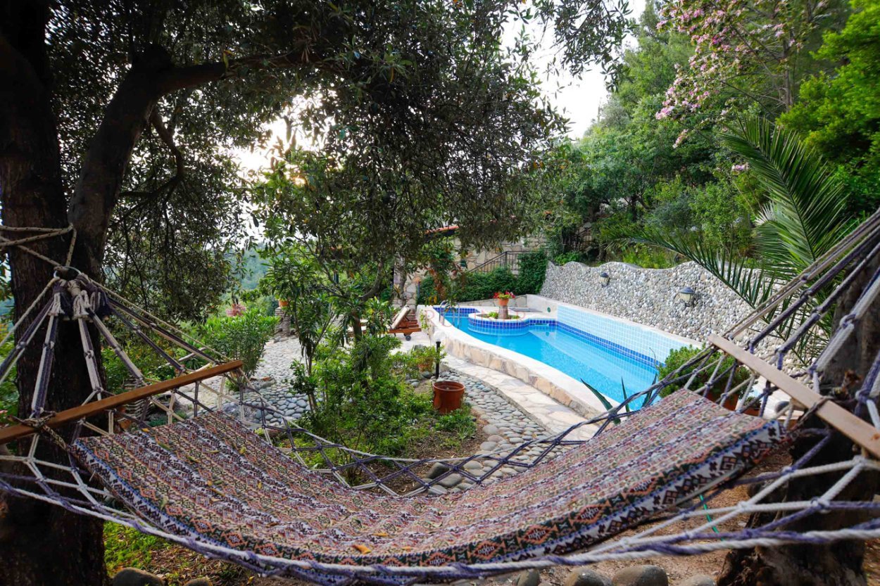 1300 x 300 x 150 cm ölçülerinde özel yüzme havuzu, 2 adet şezlong ve hamak bulunmaktadır.
