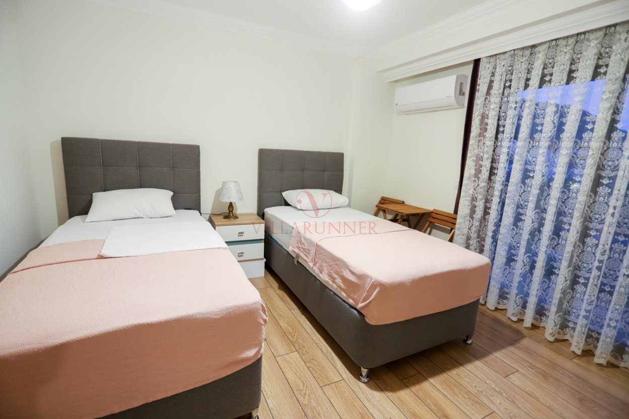 1. Yatak Odası: 2 adet tek kişilik yatak (birleştirilebilir), klima, elbise dolabı, şifonyer, balkon (masa ve 2 sandalye) (1. kat)