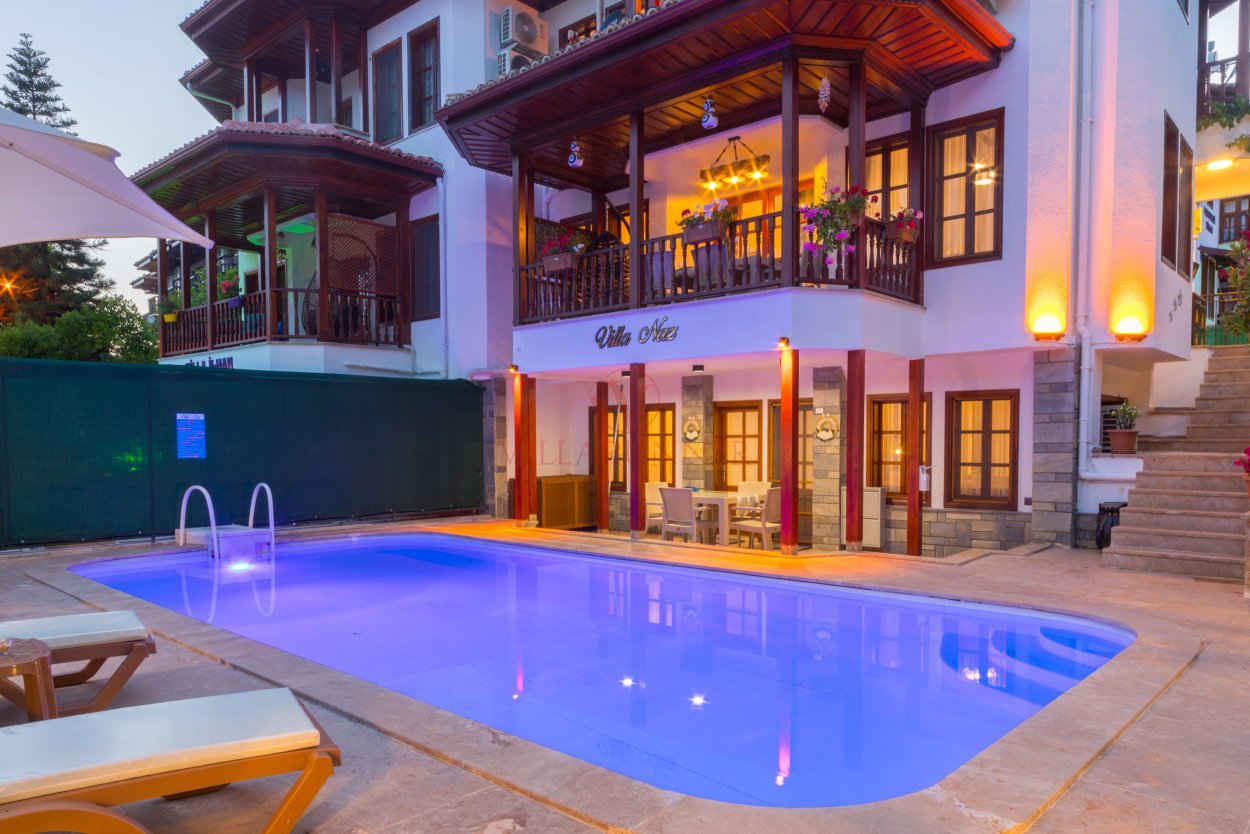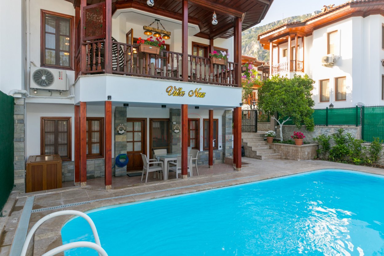 Akyaka'da ünlü Azmak nehri kıyısında yer alan Naz 1, eski Muğla evlerini andıran mimarisi ve merkezi konumu ile büyük aile gruplarının keyif alacağı 7 misafir kapasiteli bir villadır. Akyaka merkezde yer alan villa, Marmaris'e araçla 20 dakika uzaklıktadır. Villa toplam 3 katlı olup 4 yatak odası, 3 banyo (1 ebeveyn) ve müstakil bahçeye sahiptir. Yatak odalarının üçünde birer çift kişilik, dördüncü yatak odasında ise 1 adet tek kişilik yatak bulunmaktadır. Villanın açık mutfağında buzdolabı, bulaşık makinesi, dörtlü ocak, davlumbaz, fırın, tost makinesi, yemek takımı, kahve makinesi gibi temel mutfak gereçleri bulunmaktadır.