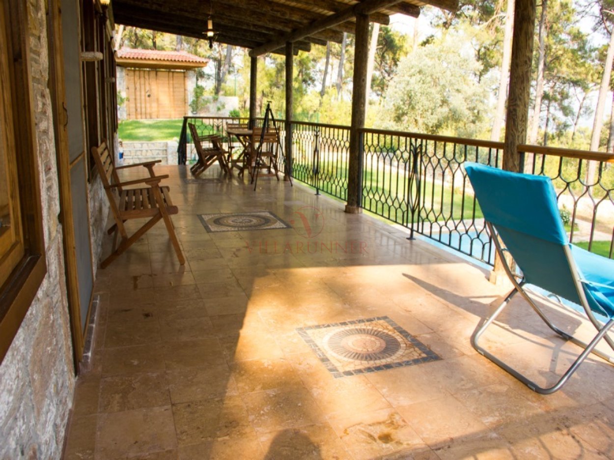 Villada 600 x 400 x 150 cm ölçülerinde özel yüzme havuzu, 4 şezlong ve 2 şemsiye; ayrıca bir oturma grubu ve salıncak bulunmaktadır. Verandada da bir yemek masası mevcuttur.