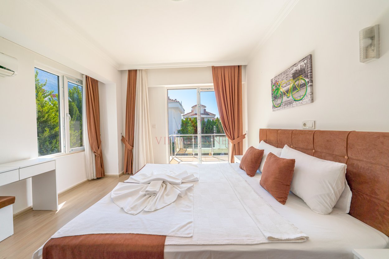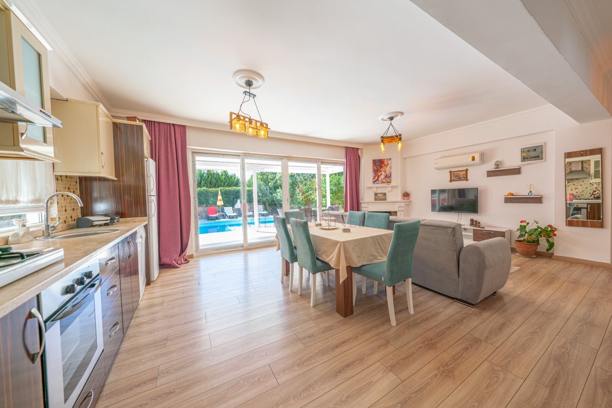 Villa Pine 8, Fethiye'nin Hisarönü mevkiinde özel havuzlu, 6 misafir kapasiteli bir tatil villasıdır. Geniş ve ferah bir şekilde tasarlanan villada üç adet yatak odası bulunmaktadır. Birinci yatak odası içerisinde çift kişilik yatak, klima yer alırken ikinci ve üçüncü yatak odası içerisinde 2 adet tek kişilik yatak ve klima mevcuttur. Üçüncü yatak odası çatı katında yer almaktadır. İkinci yatak odasından farklı olarak içerisinde televizyon bulunmaktadır. Ortak kullanım açık-mutfak, salonda ise WC-duş, televizyon ve klima mevcuttur. Ayrıca birinci ve ikinci yatak odası içerisinde küvet yer almaktadır. Villanın açık mutfağı son derece modern döşenmiş ve tam donanımlıdır.