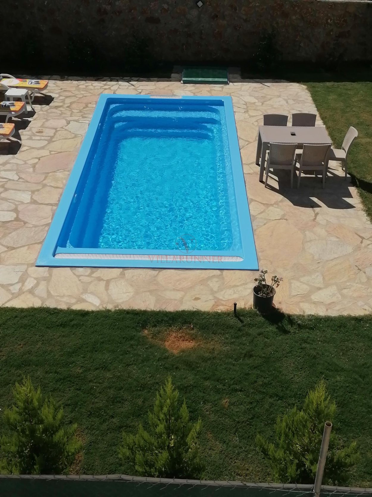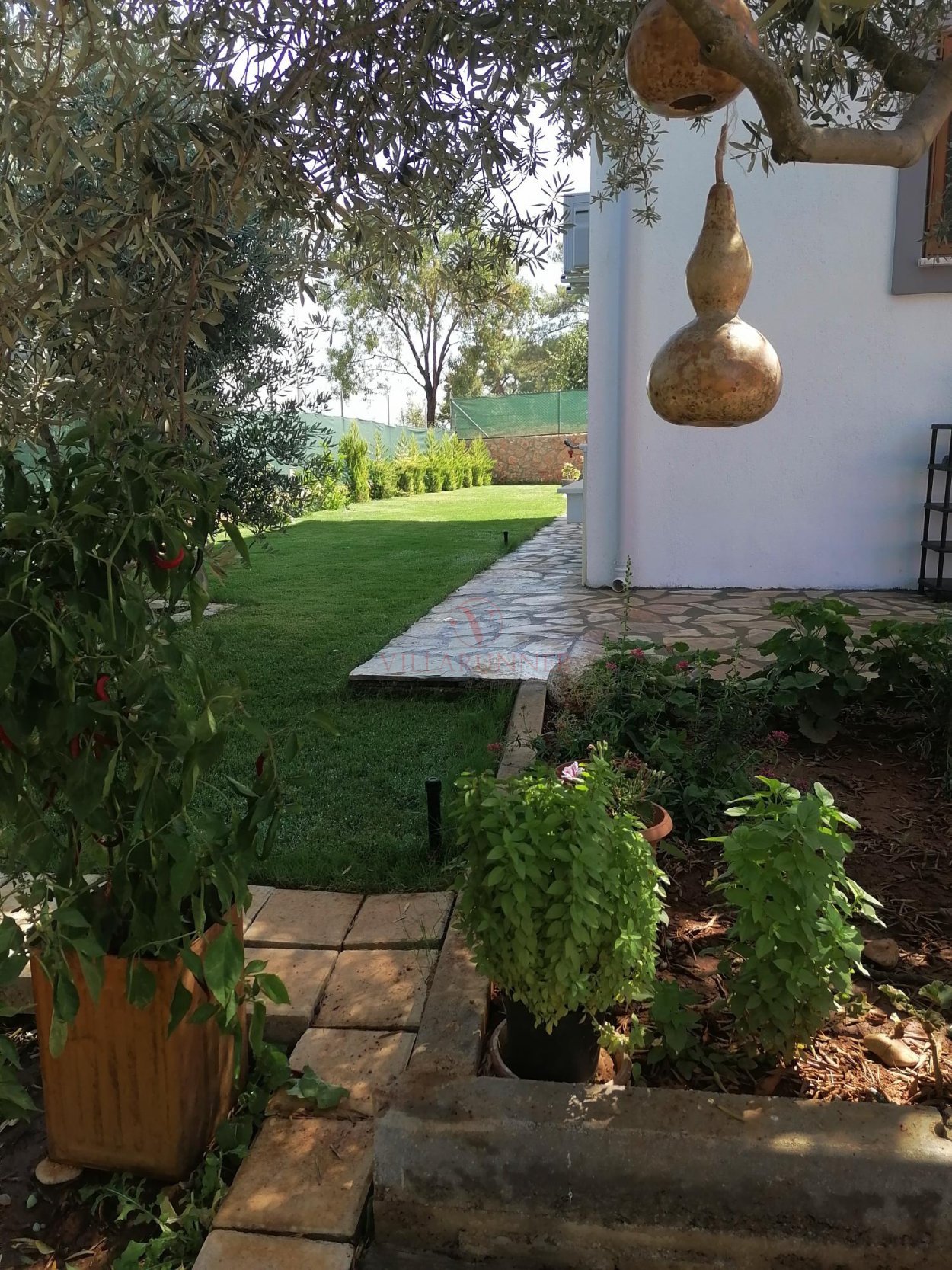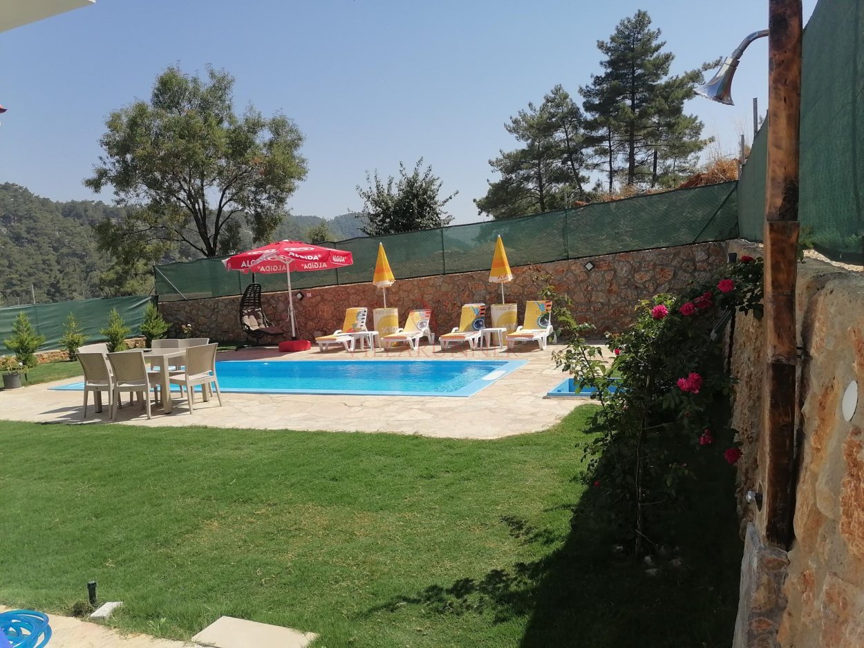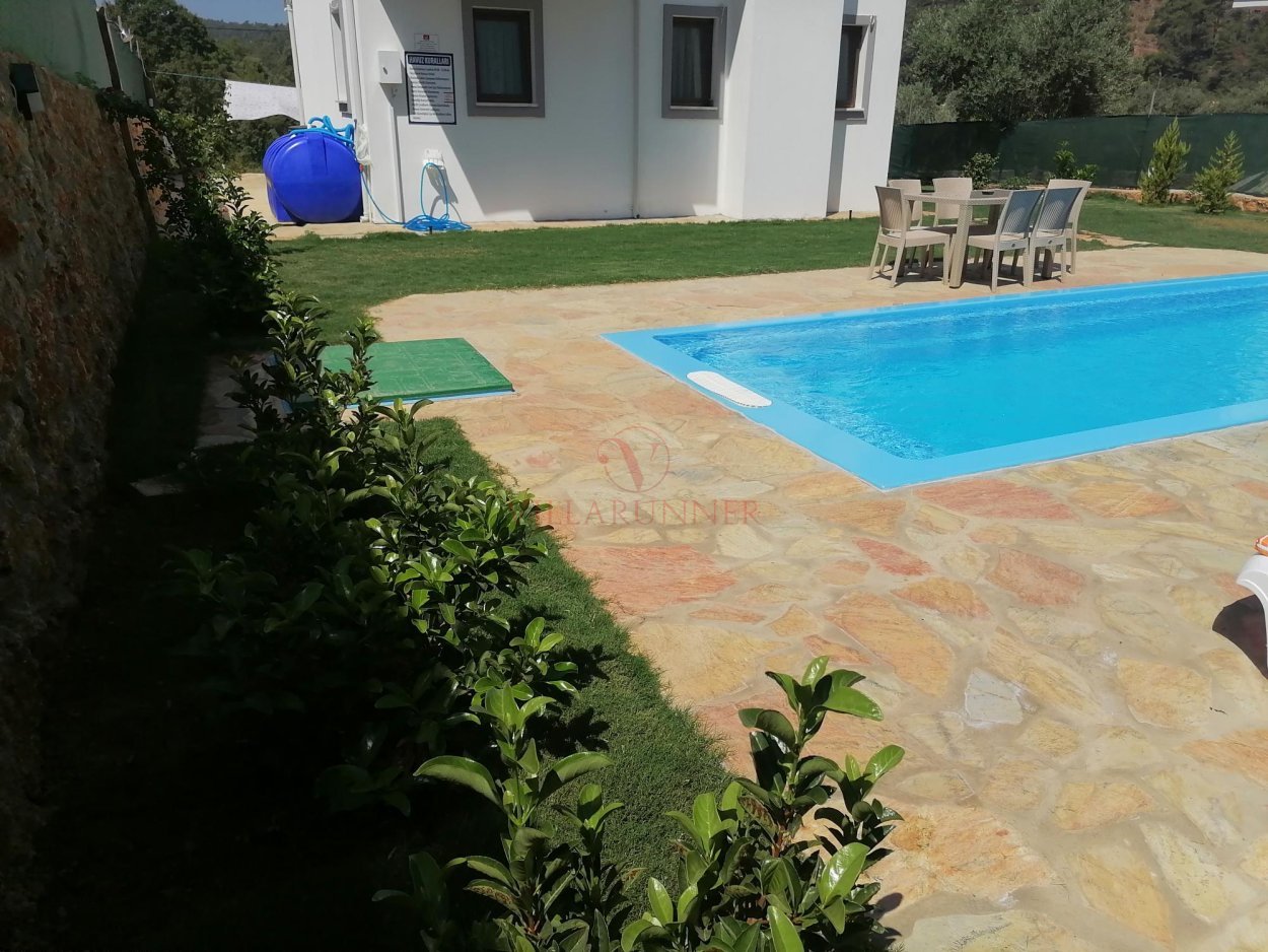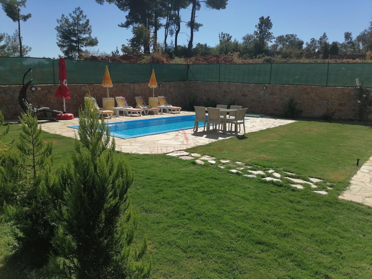Villanın 760 x 350 x 150 cm ölçülerinde özel yüzme havuzu, havuz alanında 4 adet şezlongu bulunmaktadır. Bahçede tekli salıncak, yemek masası ve oturma grubuna ek olarak taş barbekü olanağı mevcuttur.