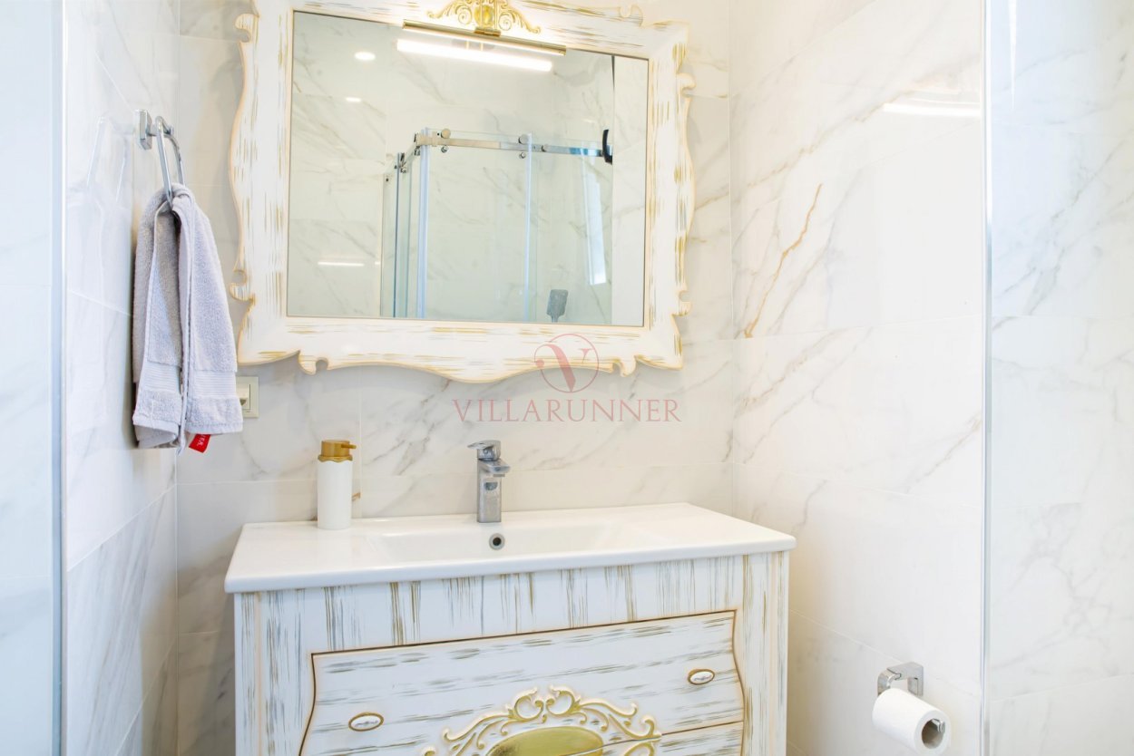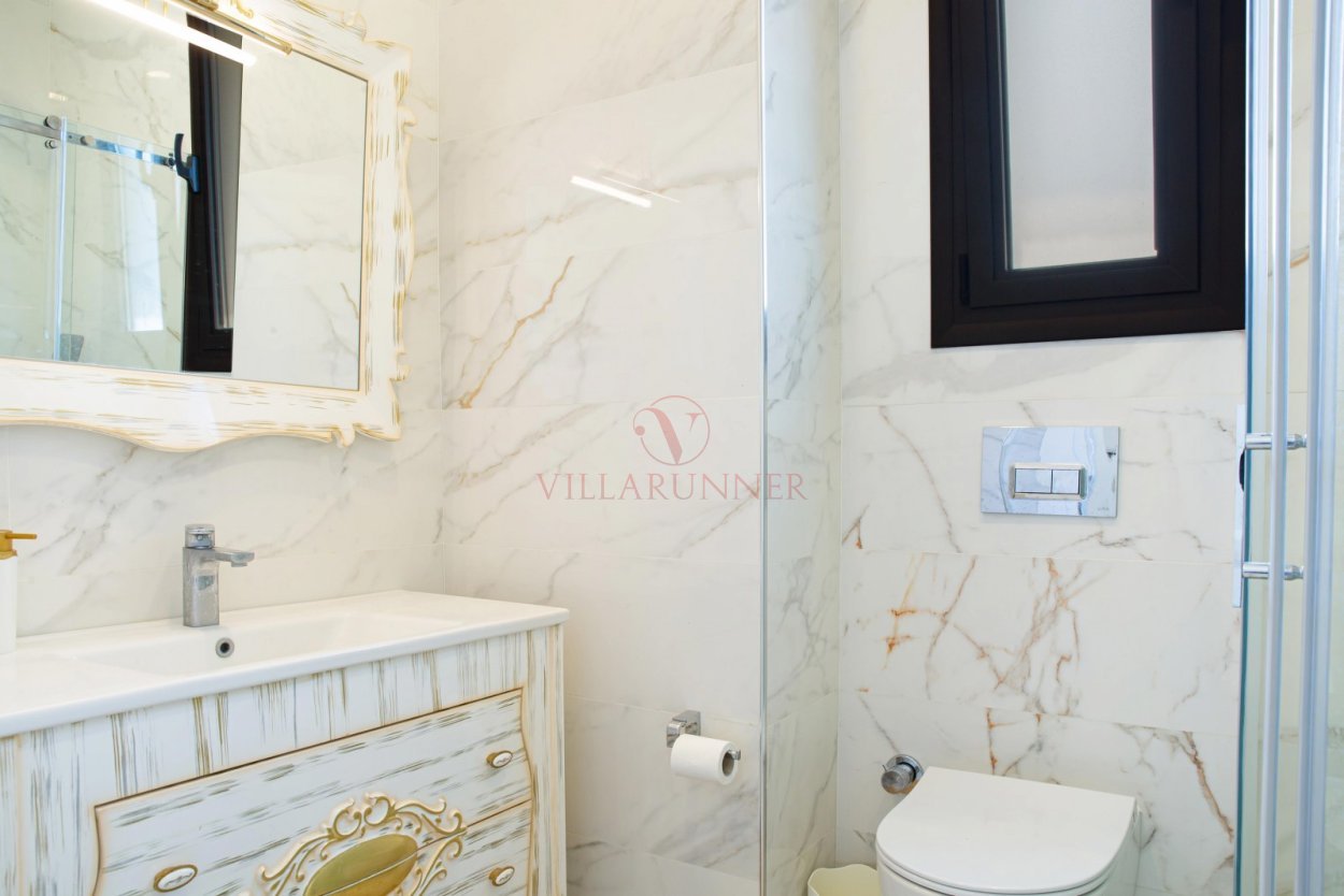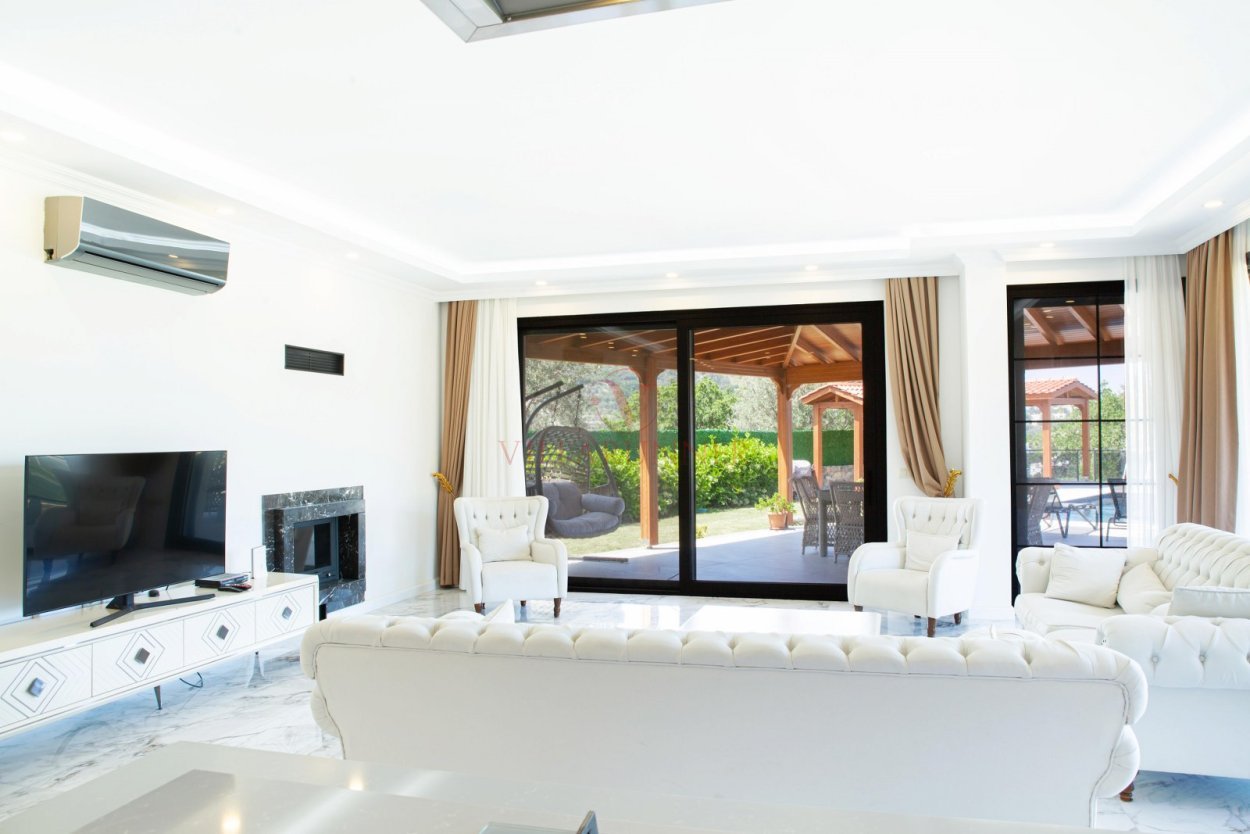 Oldukça geniş ve yarı-korunaklı özel havuz ve bahçeye sahip bu şık tatil evinin girişinde, 3 araçlık özel park alanı bulunmaktadır. Bu bölümden; açık yüzme havuzu/bahçe bölümüne ve evin ana giriş kapısına geçiş sağlanmaktadır. Dubleks villanın giriş katında açık plan salon, tam donanımlı mutfak, ayrı yemek alanı, 1 adet 2 tekli yatağa sahip yatak odası ve banyo / tuvalet bulunmaktadır. Üst katta biri giyinme odalı, çift kişilik yataklı ve kanepeli oldukça geniş master yatak odası, hemen yanında bu oda ile birlikte kullanılan, misafirlerin sabah kahvelerinin keyfini kuş sesleri ile çıkarabileceği balkona sahip çift kişilik yatak odası bulunmaktadır. Bu katta 2 adet tekli yatağa sahip bir oda daha bulunmaktadır. Odaların tamamı klimalıdır ve evde toplam 4 adet banyo / tuvalet mevcuttur.