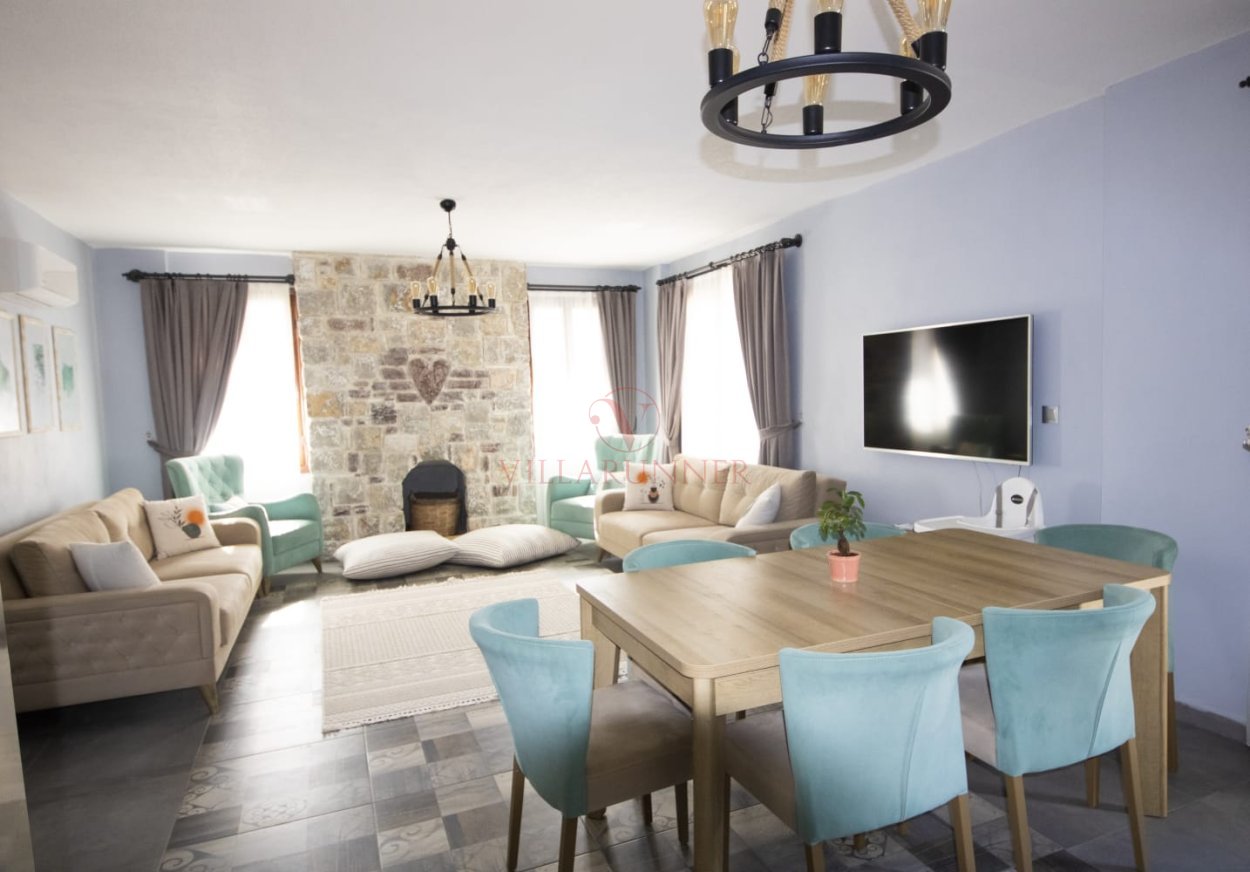* Salon: 2 adet tek kişilik, 2 adet üçlü, klima, televizyon, sehpa, şömine, masa ve sandalyeler bulunmaktadır. (giriş kat)