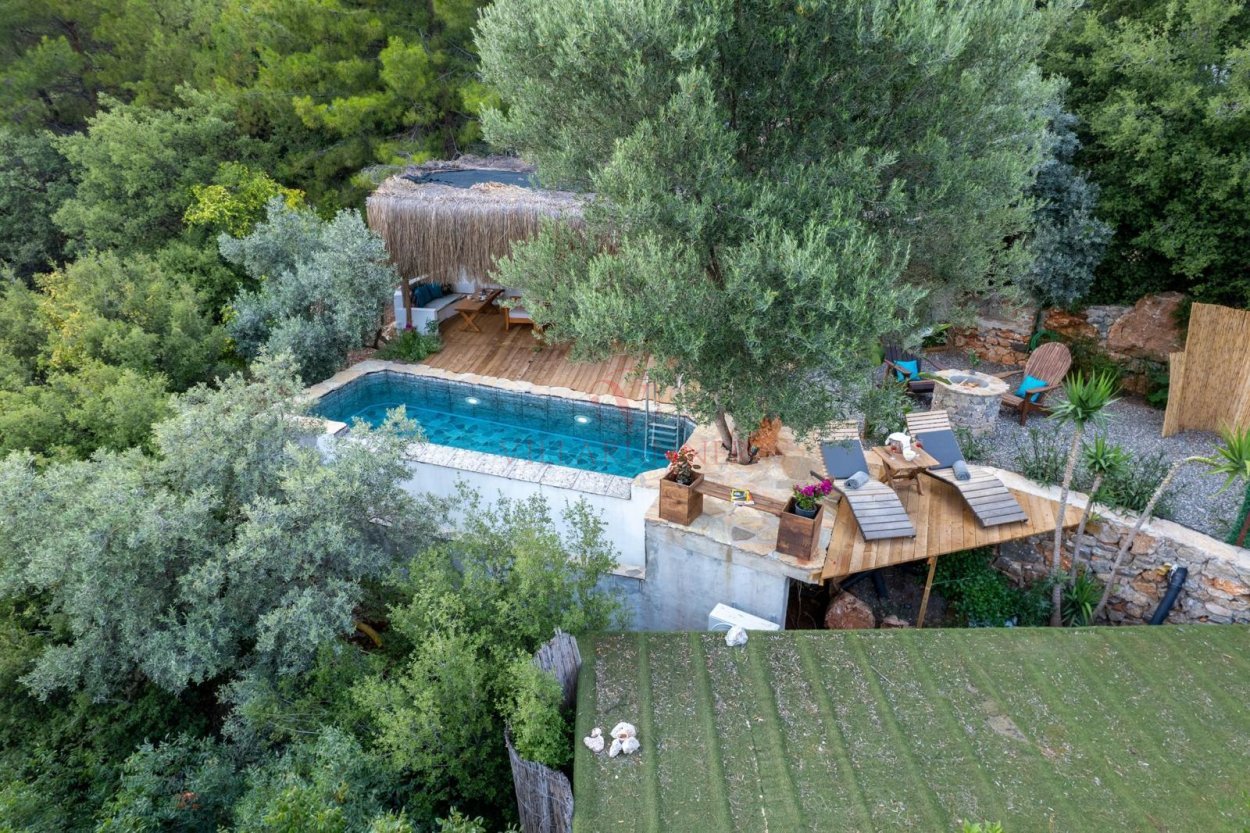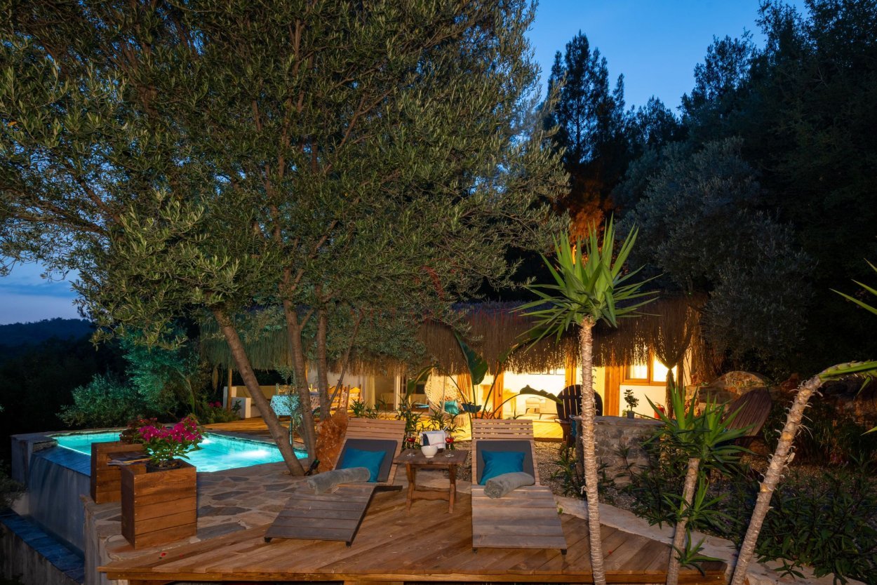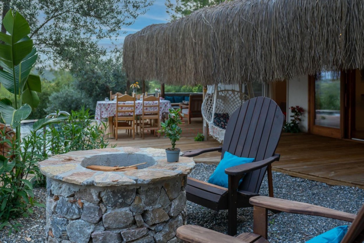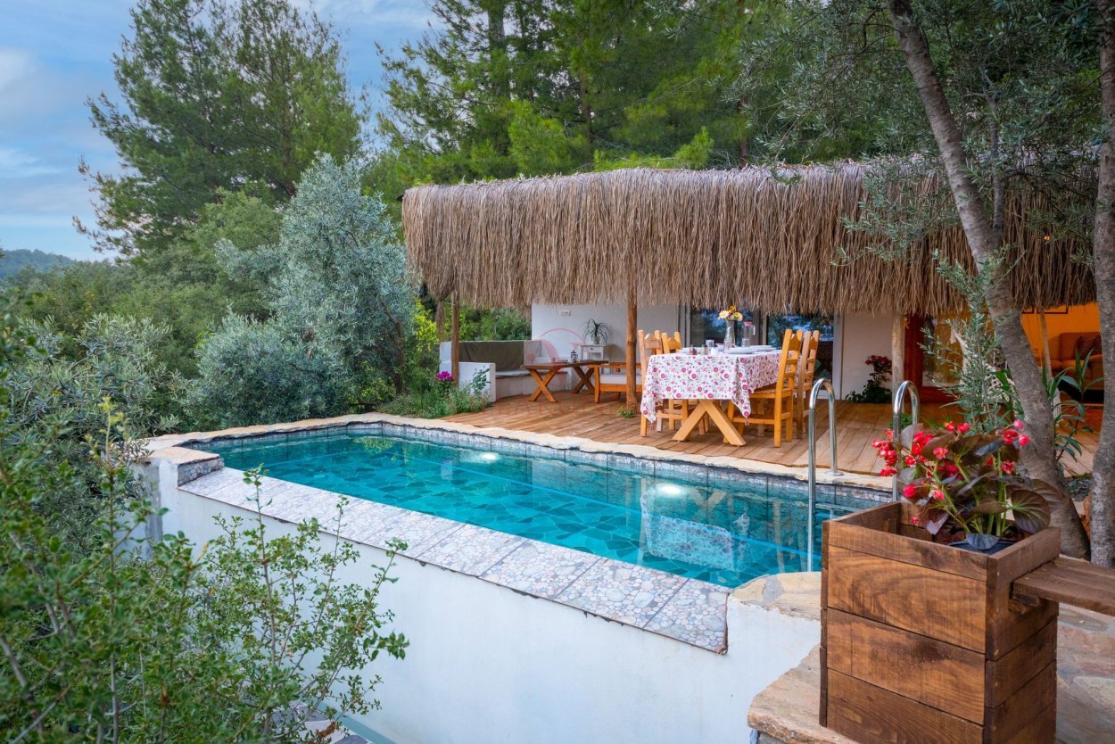 Çam Evi'nde özel yüzme havuzu, 2 adet şezlong, taş oturma grubu ve salıncak bulunmaktadır. Bahçe alanında barbekü ekipmanının yanı sıra bir ateş çukuru mevcuttur.