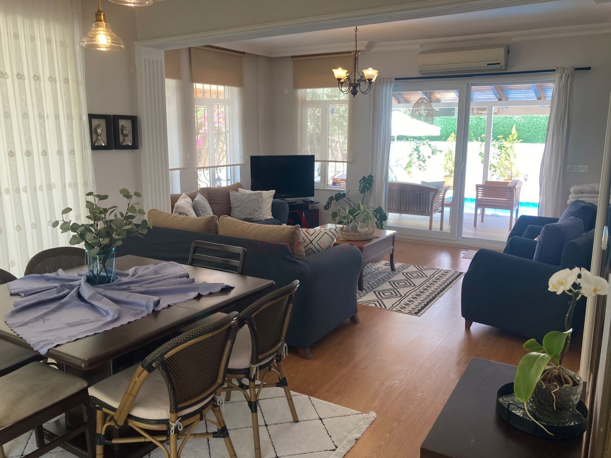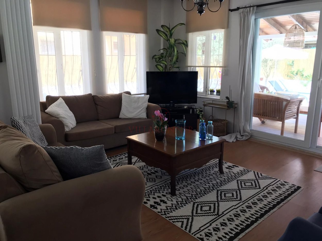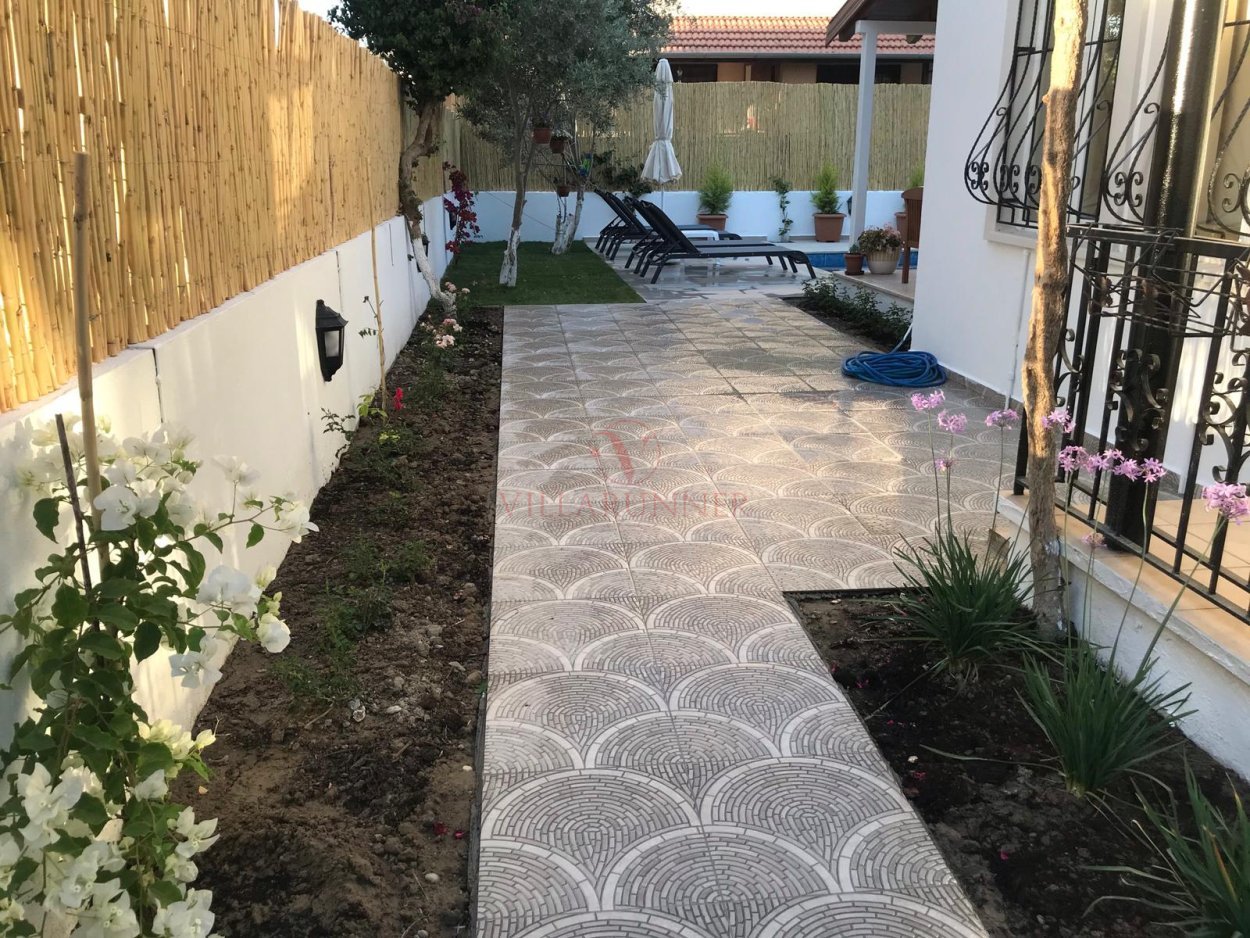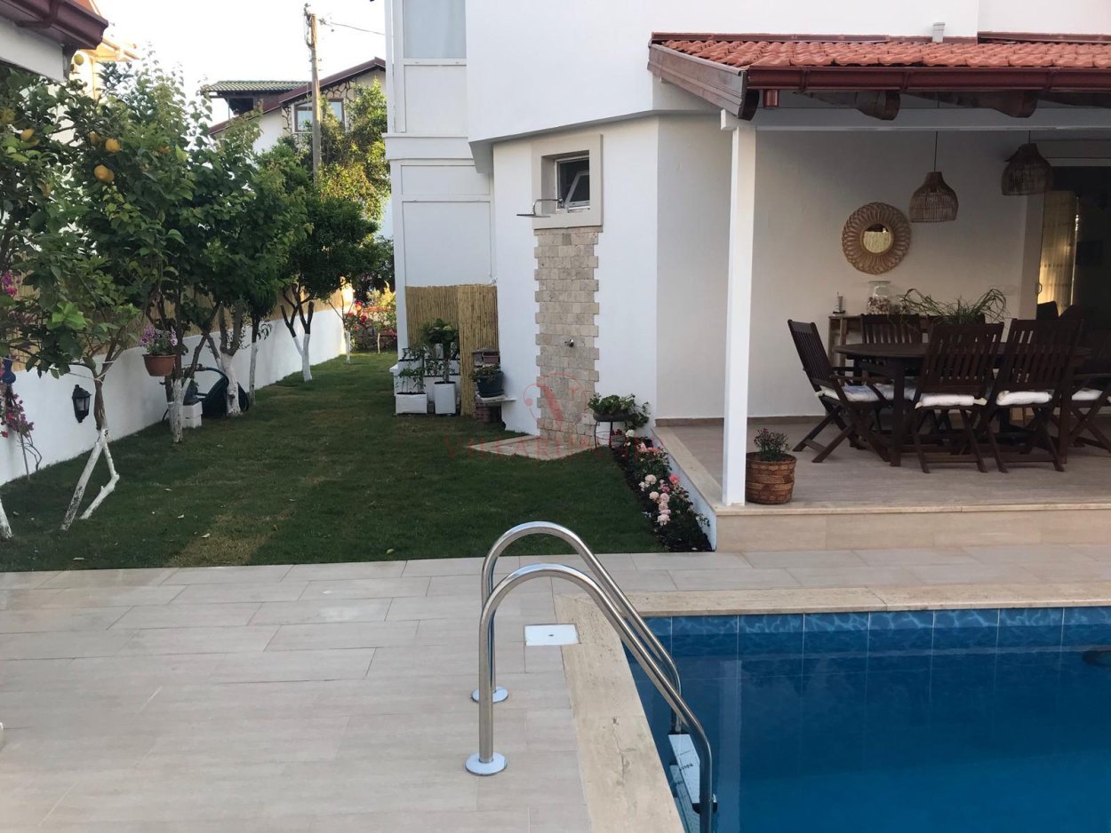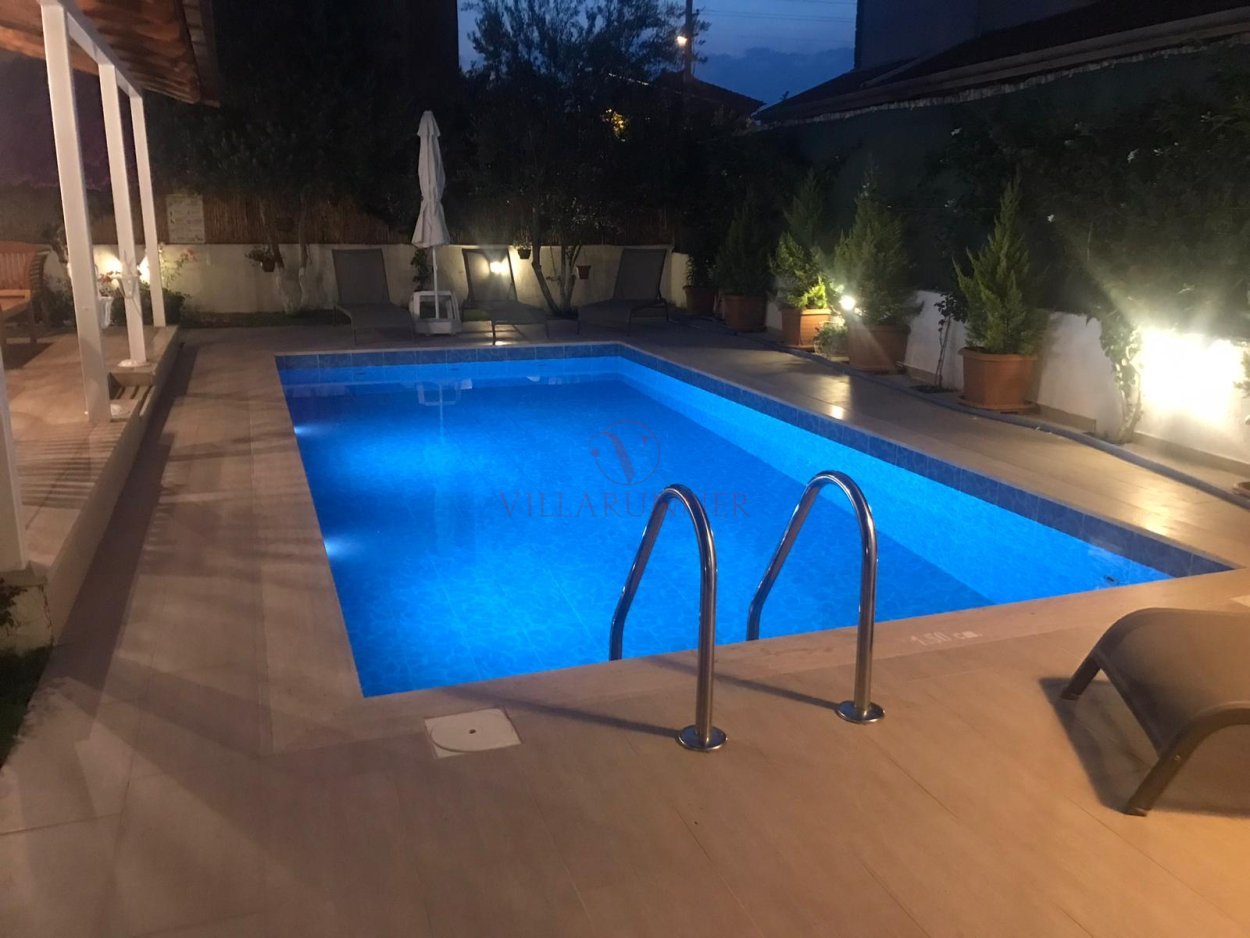 Villanın 800 x 400 x 150cm ölçülerinde özel bir yüzme havuzu; havuz alanında 4 adet şezlong, şemsiye, yemek masası ve sandalyeler, oturma grubu ve barbekü de vardır.