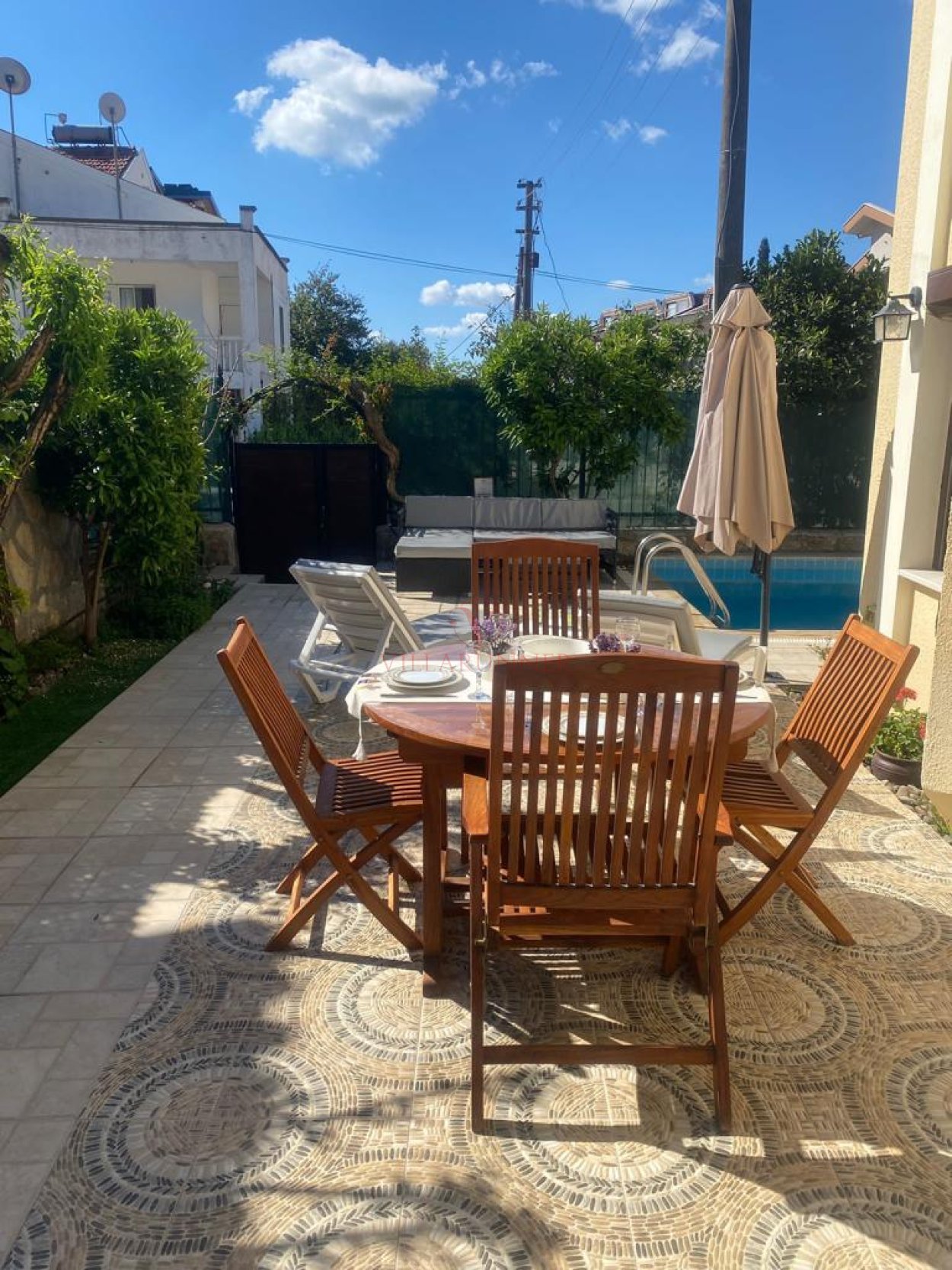 800 cm x 400 cm x 160 cm ölçüsünde yüzme havuzu bulunmaktadır. Ekstra olarak yanında, Dört adet şezlong, duş alanı bulunmaktadır.
