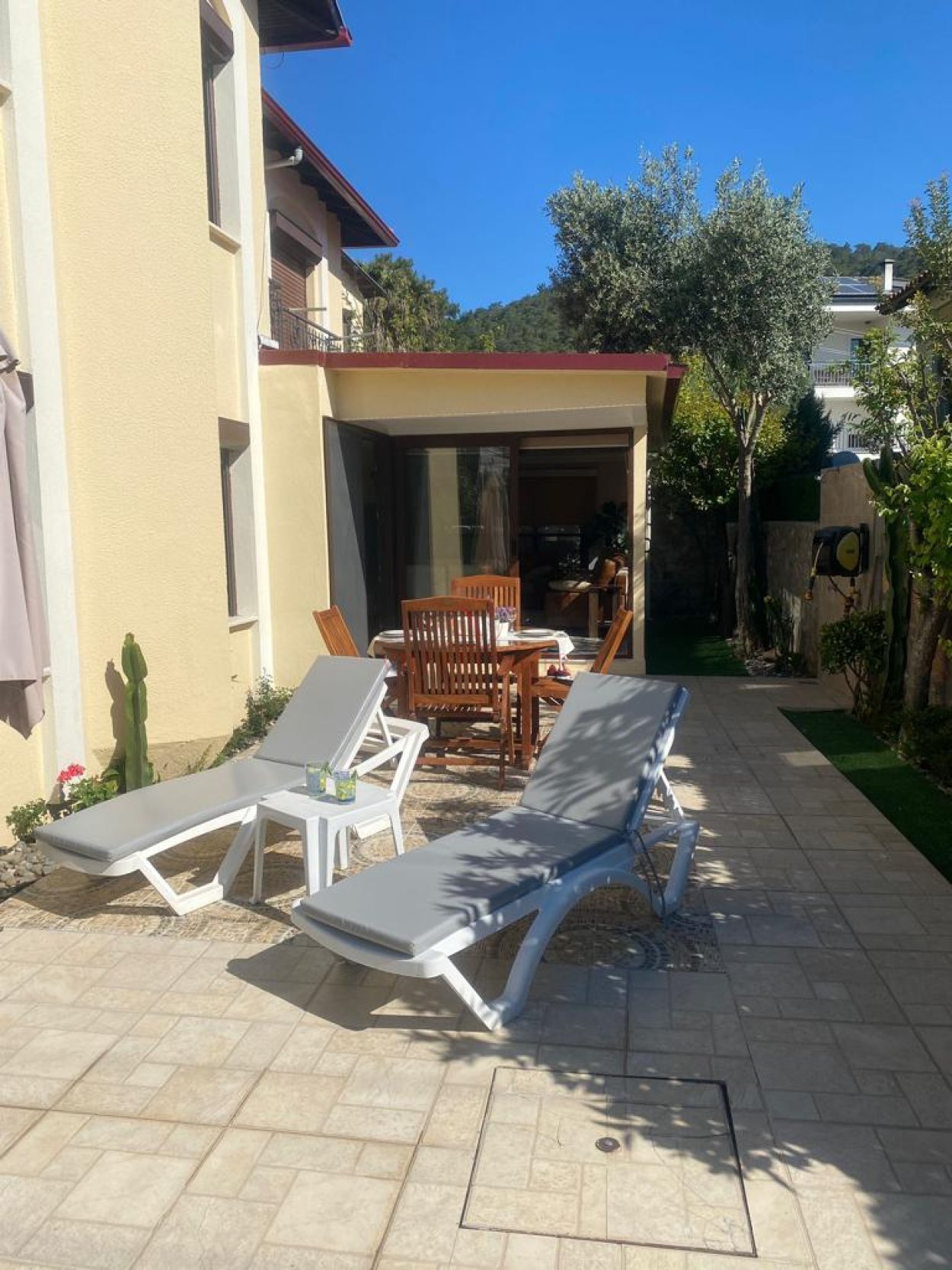 Bahçemizde oturma grubu (iki adet ikili koltuk + masa), verandamızda oturma grubu + orta sehpa, televizyon, yemek masası ve sandalyeler bulunmaktadır.