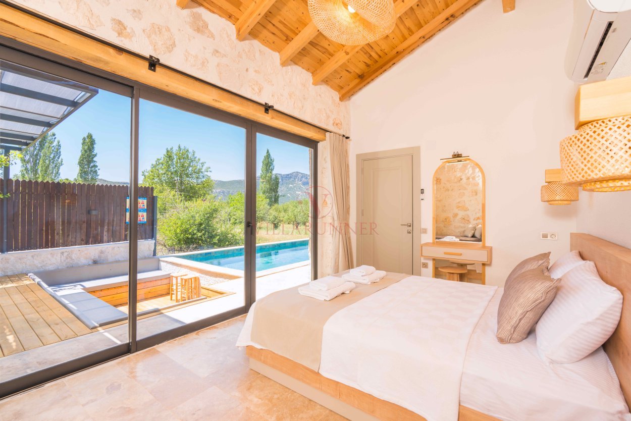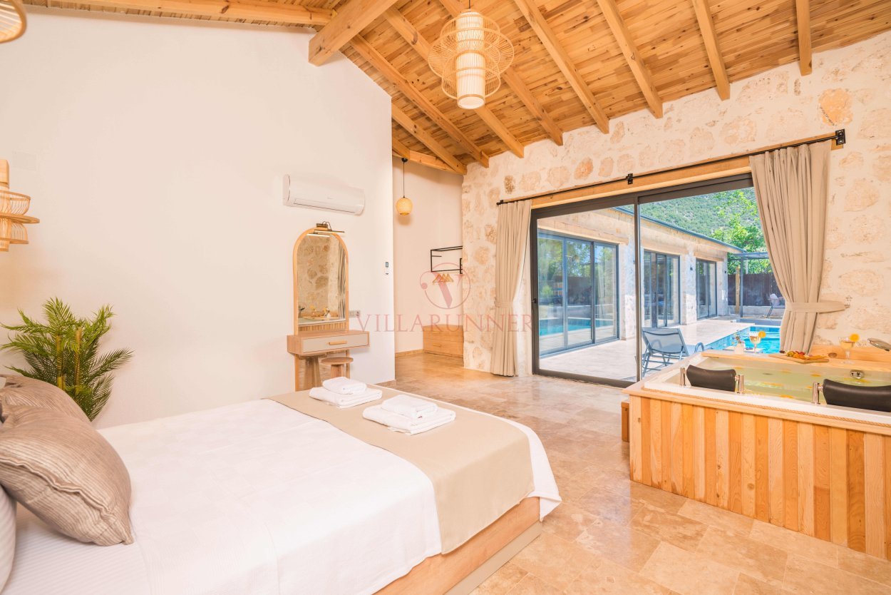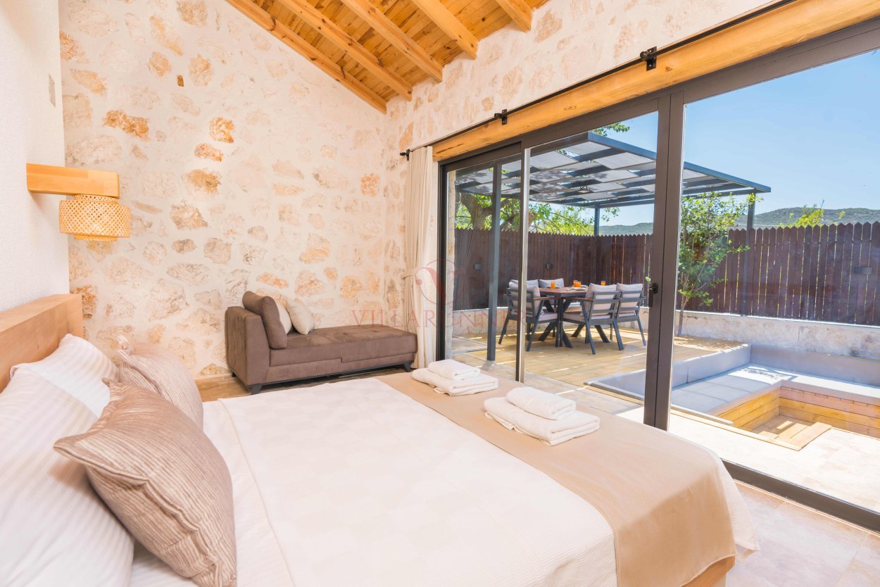 Kalkan'ın huzur dolu doğasında dağ manzarasına sahip lüks villalardan biri olan Villa Alaf, misafirlerine taş evin serin duvarları arasında ve ahşap çatının sıcacık atmosferinde huzurlu bir tatil imkanı sunuyor. Müstakil havuzu olan tek katlı villanın 4 misafir kapasitesi var. Master yatak odasında bir çift kişilik yatak ve jakuzi; diğer odada ise iki adet tek kişilik yatak var. Odaların ikisinde de klima mevcut. Villanın iki yatak odasına ait ebeveyn banyoların yanı sıra bir de ortak banyosu bulunuyor. Villada odalardan ve ortak yaşam alanlarından havuza geçiş sağlanabiliyor. Villa Alaf korunaklı bahçesinin ardında keyif dolu tatil anıları vaadiyle kapılarını ilk kez bu yıl misafirlere açıyor.