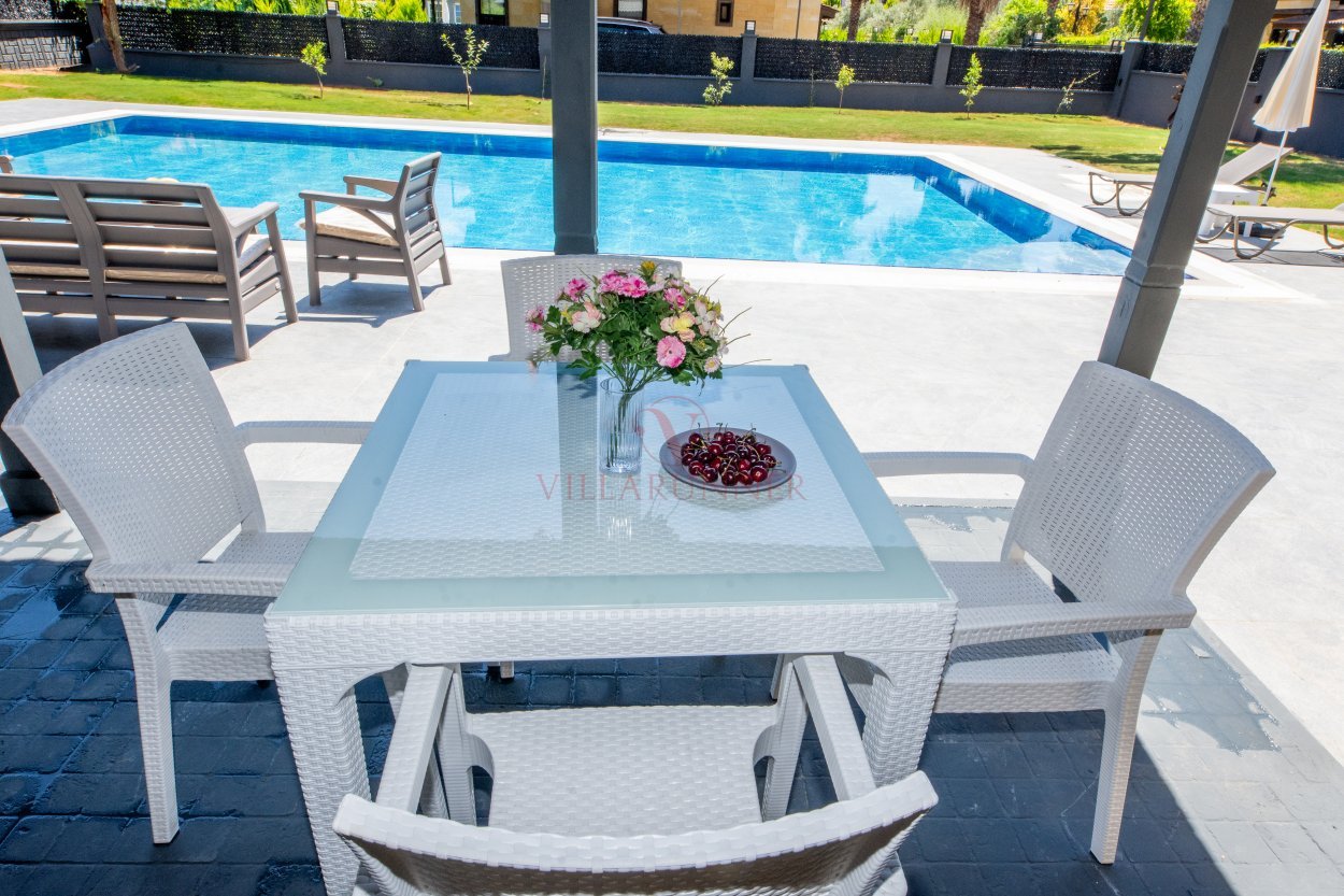 Havuz 1150 cm x 700cm x 150cm ölçülerinde geniş bir yüzme havuzudur. Villanın en keyifli bölümlerinden biri olan bahçede ise şezlong, bahçe yemek masa ve sandalyeler ve mangal ekipmanı bulunmaktadır.