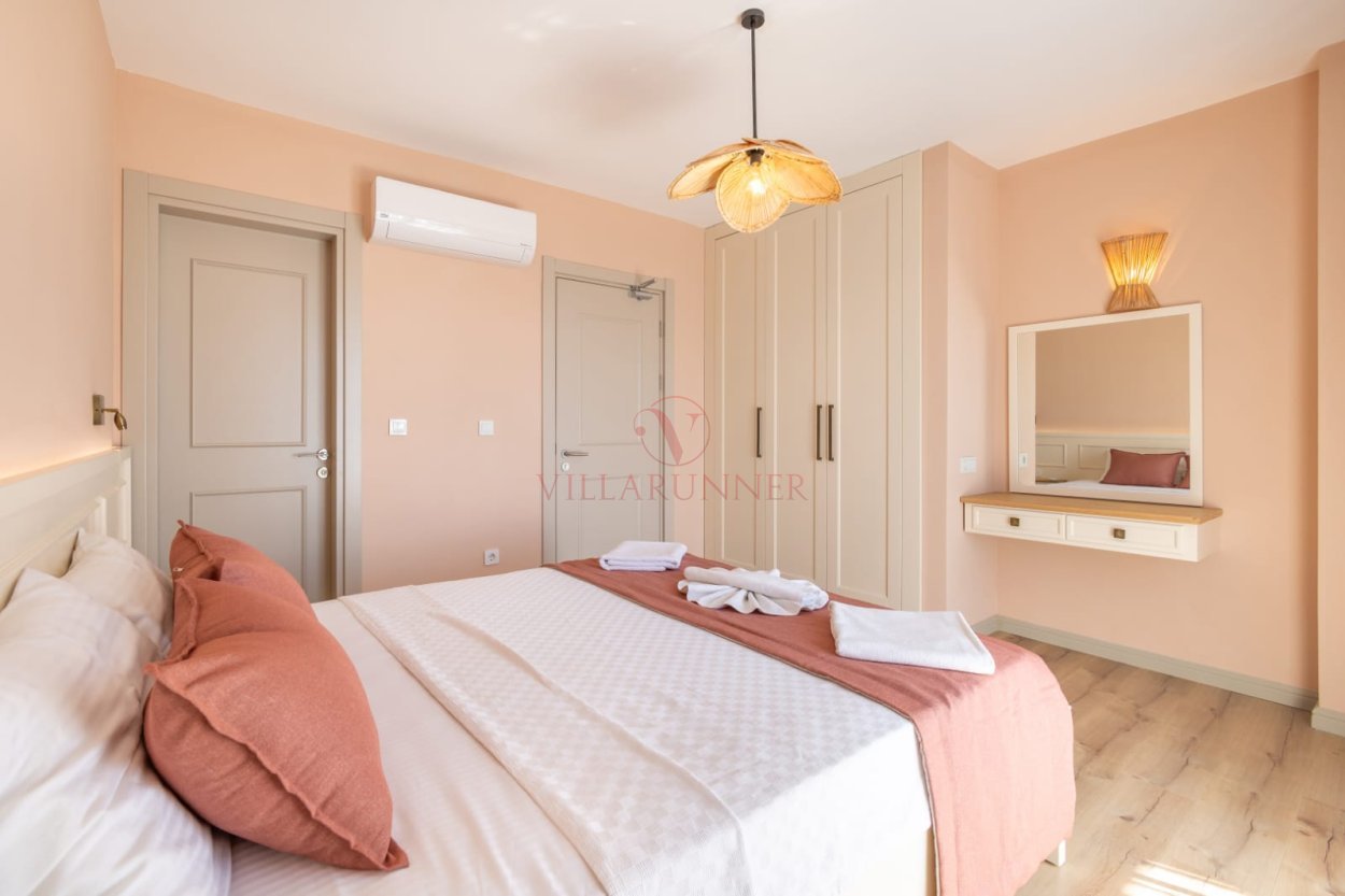 2 yatak odası, açık mutfak ve salonuyla 4 kişiye kadar konaklama kapasitesine sahiptir. Aynı anda kalabalık gruplar ya da birden fazla aile için de uygun olan bu villa, yan yana konumlandırılmış iki müstakil yapısıyla dikkat çeker. Her iki villa da birbirinden tamamen bağımsız ve kendine ait özel alanlara sahiptir. Dileyen misafirler, bu ikiz villaları birlikte kiralayarak daha geniş bir tatil alanı oluşturabilir.