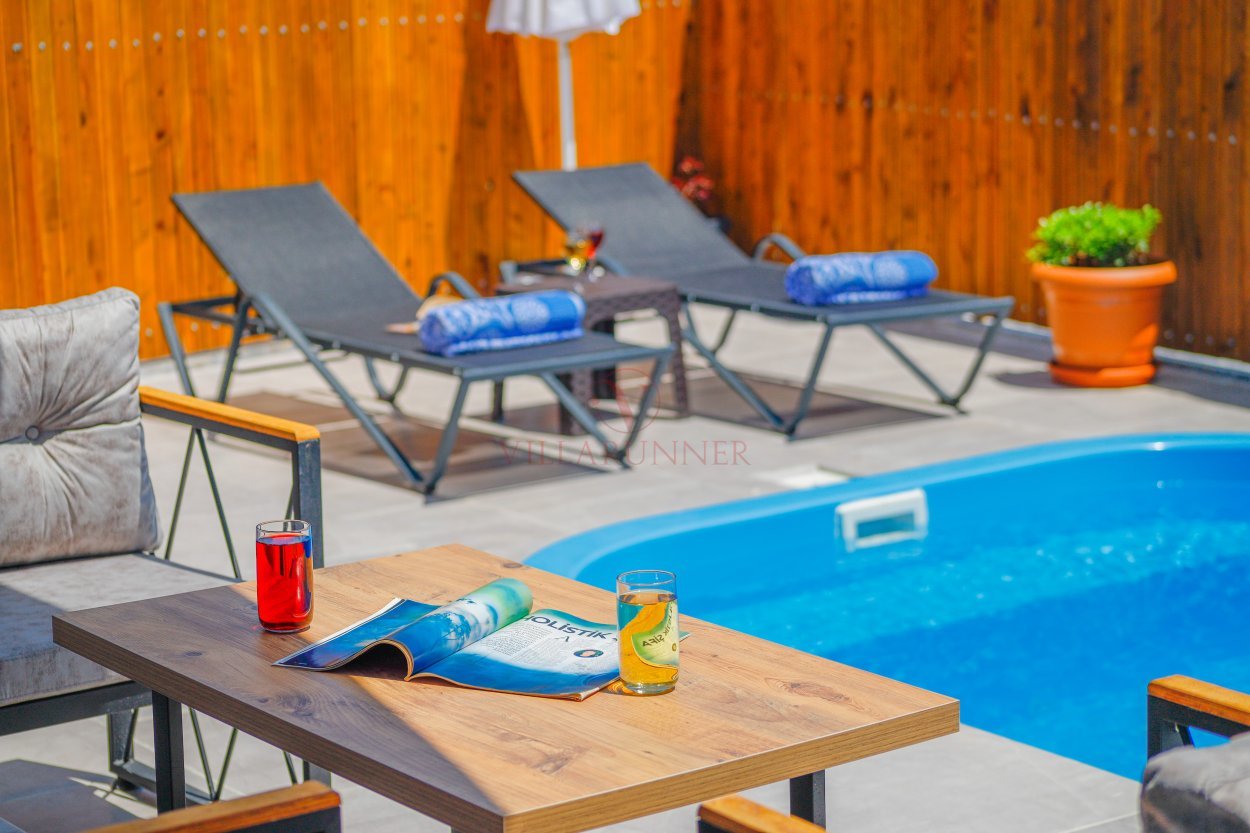 3M X 6M Derinlik 1.5M ölçülerinde Özel bir havuza sahiptir. Ayrıca bahçe alanında Şezlong ve Masa takımı mevcuttur.