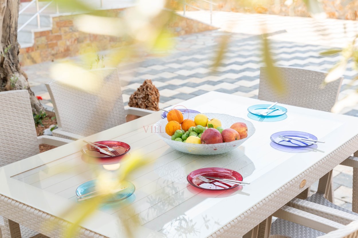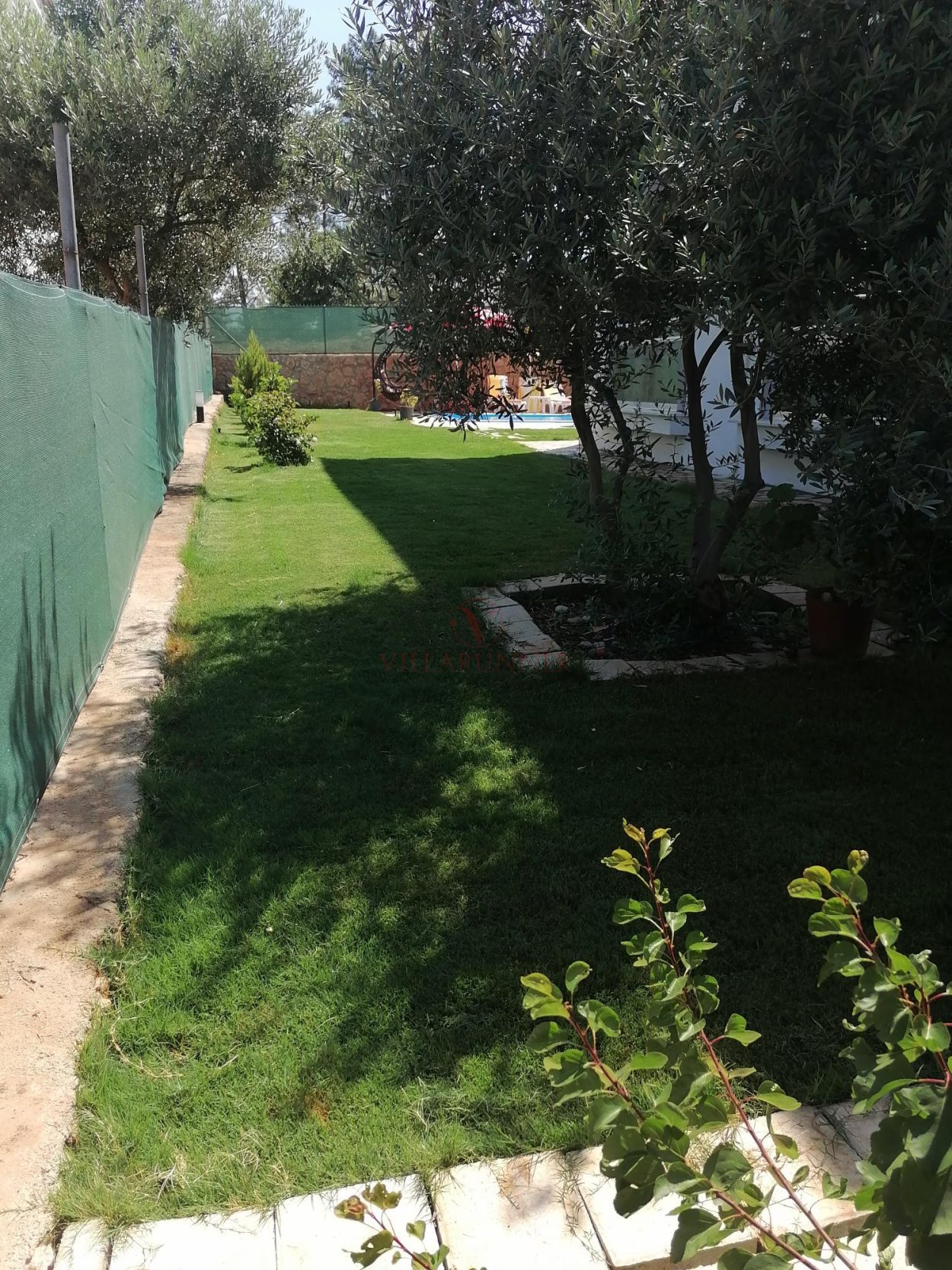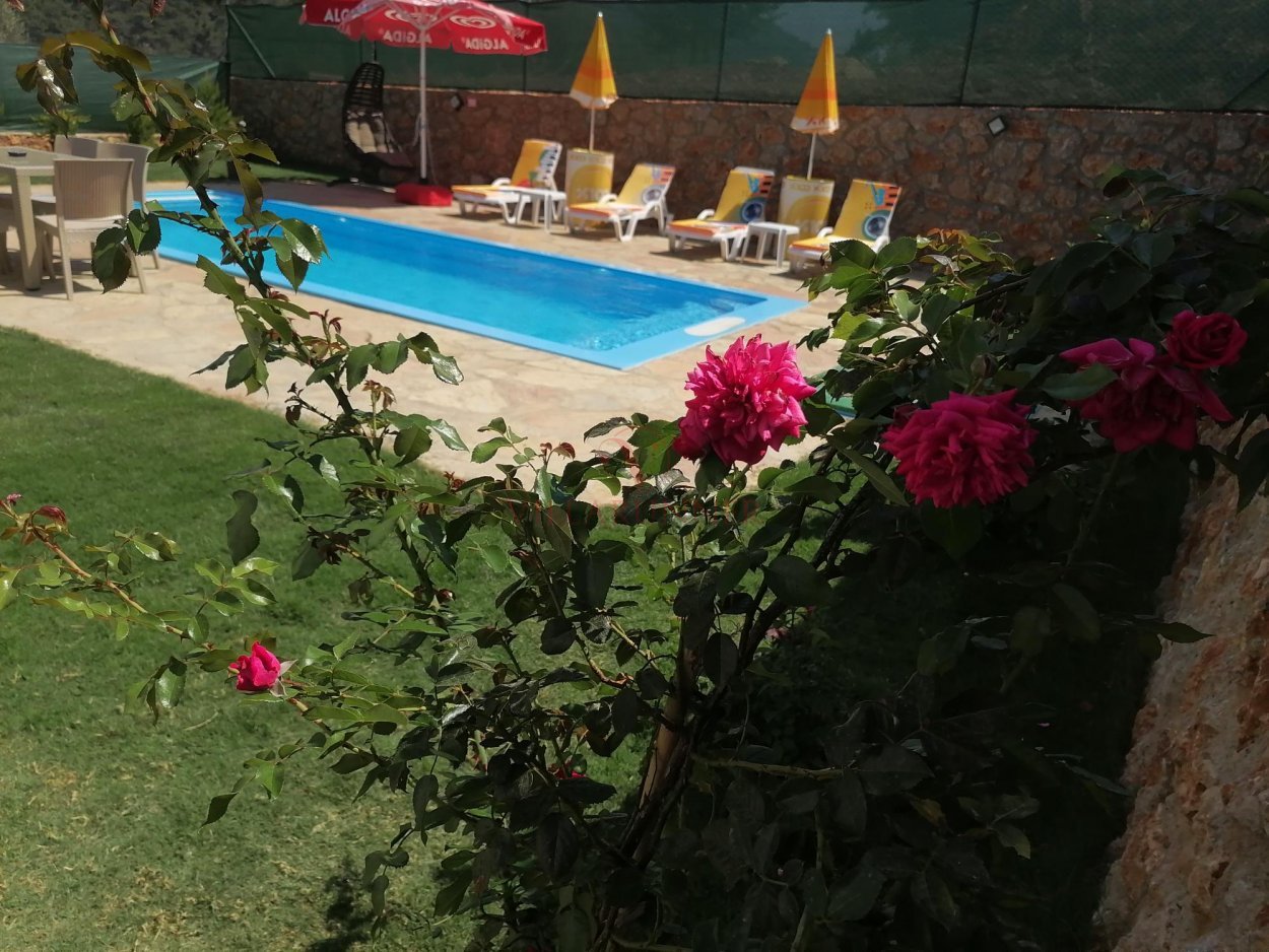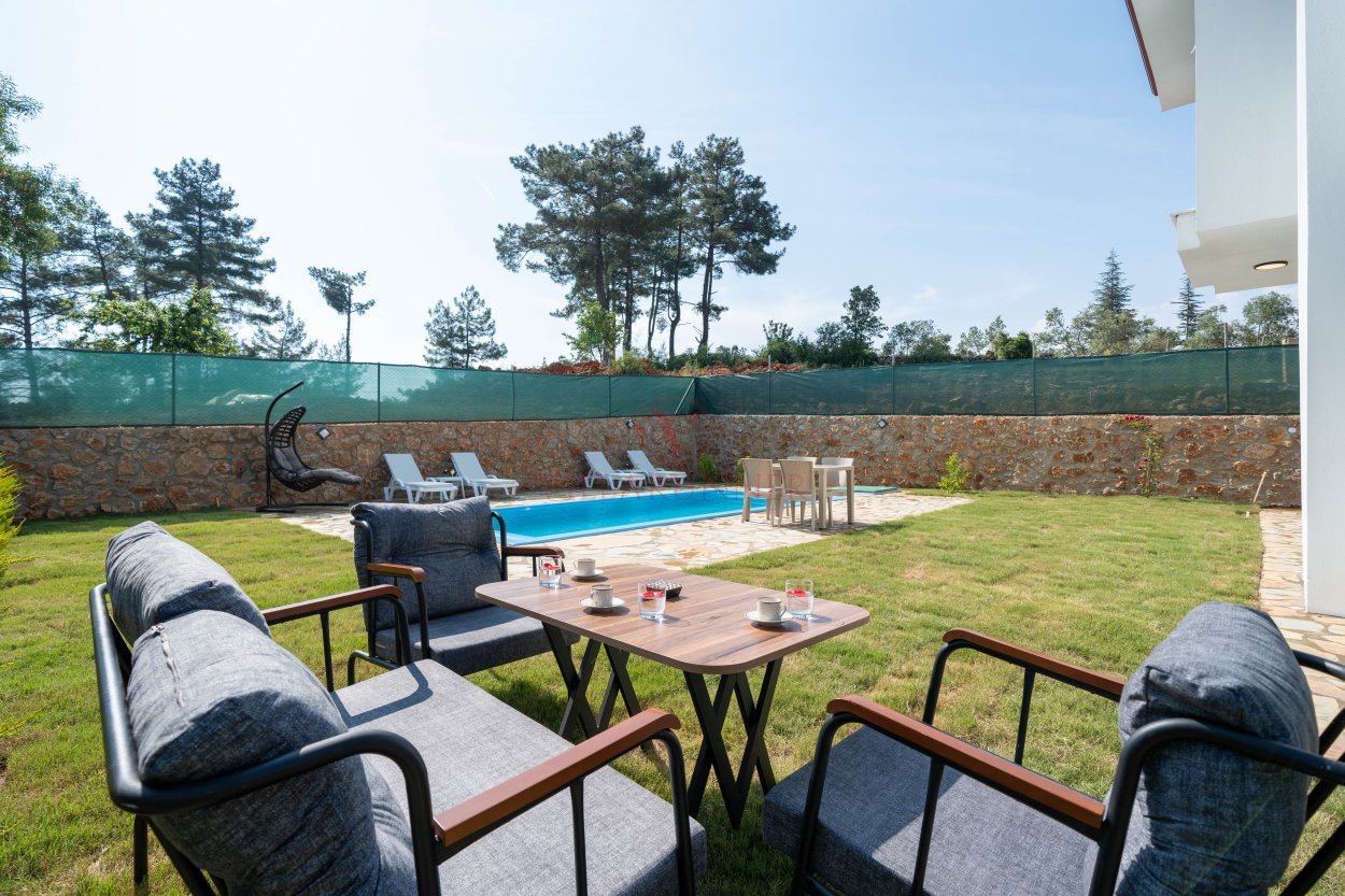 Villanın 760 x 350 x 150 cm ölçülerinde özel yüzme havuzu, havuz alanında 4 adet şezlongu bulunmaktadır. Bahçede tekli salıncak, yemek masası ve oturma grubuna ek olarak taş barbekü olanağı mevcuttur.